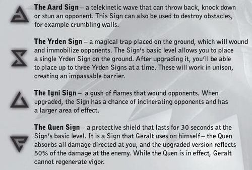 Quen:防御魔法,吸收全部伤害直到上限或者持续时间结束.在这个状态中,精力是不能回复的.升级后可以反弹部分伤害.