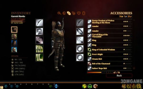 首要的当然是电抗,越高越好(不过好像还无法做到免疫)。那么黑市DLC有个箱子里有+298电抗的皮甲胸,上边还有个槽,又能加298。头盔、手套和鞋在游戏进行中看见有槽的一定要留下来,镶上电抗符文。如果你在EA Store上预定了游戏,还应该有个+127电抗的腰带The Irons,装备上,这样不论是BOSS打你还是小怪打你都和挠痒一般。因为我打到这里没有有槽的头盔,腰带也没有(可恨的steam!最受歧视的主),不过还是凑到了849电抗(12级下减免88%),solo也足够了。药一定要带足,起码带5个精灵草药和2个恢复药吧,防止血线过低。