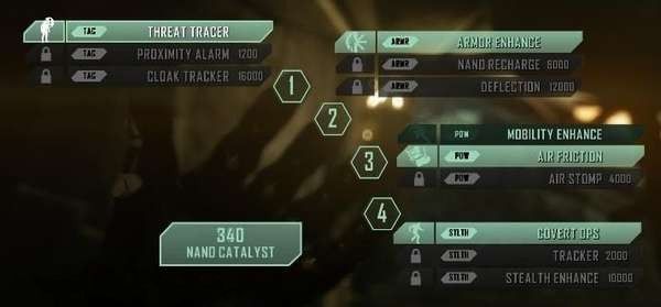 我来配图解释一下吧,这个是pc版的图,各技能的解锁并没有先后顺序,只要钱够了就可以自己选择升级哪个,只能同时装备4个技能,高亮显示的是目前装备的技能,按RT选定。我大概是打了2/3左右的外星人,1/3左右隐身闪人,最终boss之前正好升满。