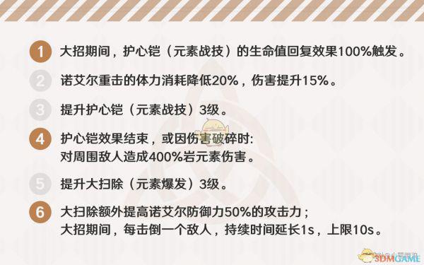 每4次普攻/蓄力可减少1s护心铠CD。在诺艾尔不当主C的阵容里,次天赋只能作为锦上添花的存在,减CD的效果在实际应用中会有感知,但并不强烈。