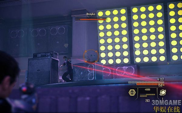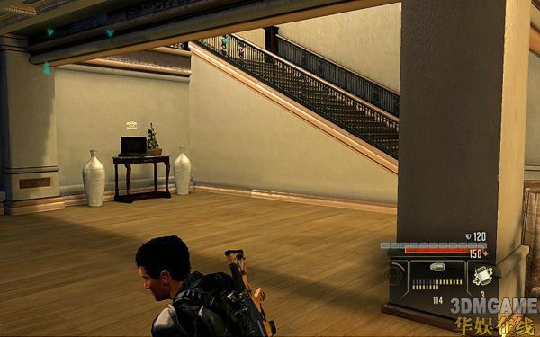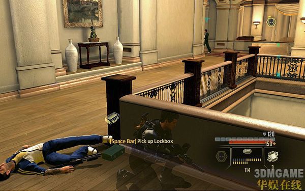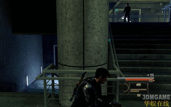 然后继续使用STEALTH技能从最近的路线潜行过大厅;来到如下图的楼梯位置,锁喉掉下面楼梯的敌人