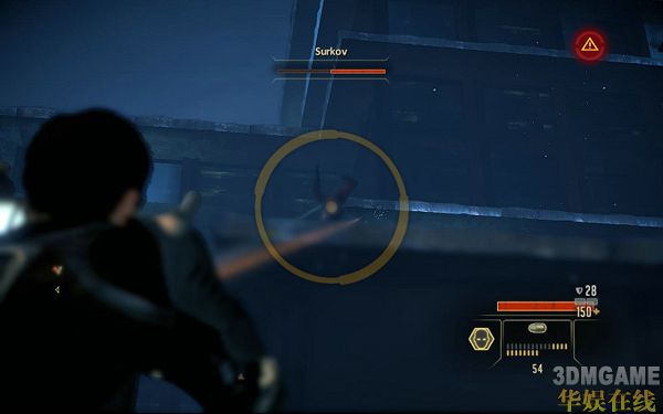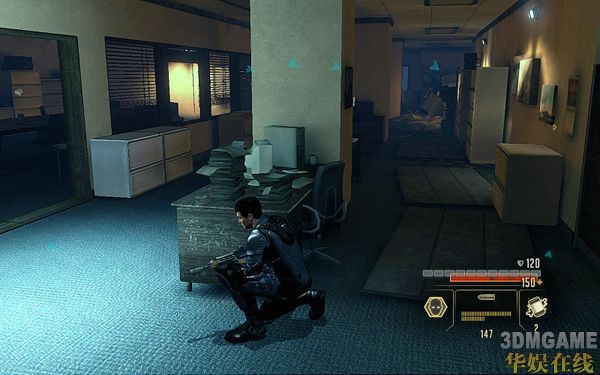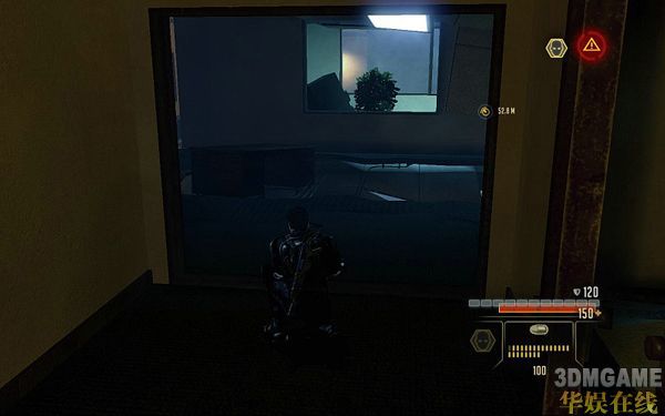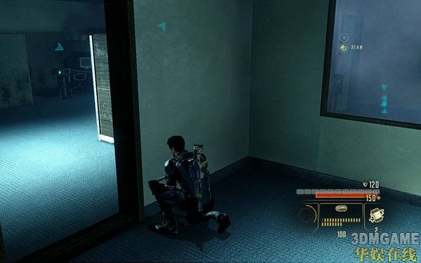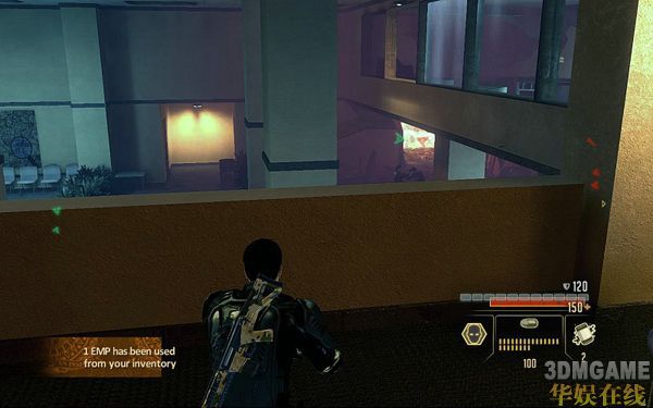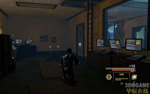 一路继续前进;可以看到前面一共有7个敌人;此时可以使用STEALTH技能先狙杀掉右边2个窗户的敌人减小被发现的几率;然后使用STEALTH仅能前进到任务指示的电脑面前HACK掉即可进行下一步