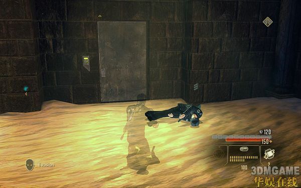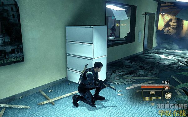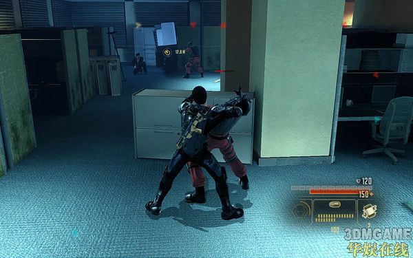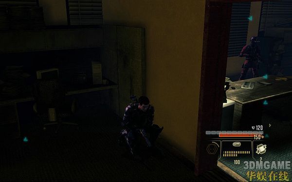 然后一路从左边耳朵房间潜行过去;使用STEALTH技能来到如下图的位置。注意到这里房间的敌人是落单的,狙杀之;然后躲到他的柜子后面等待技能恢复