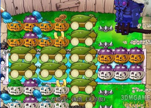 顺便说一下,3-4路前面那两个玉米可能会被水下僵尸浮起来吃掉,我说一个小技巧,每一轮为2关,在第二关出现红字的时候,数5秒钟,然后马上对那两个玉米开2-4炮,目的就是把水中僵尸炸死,我一般用4个炮,保险!再说,10个炮用4个也不浪费!别的就没什么教的,上路1炮,下路1炮!被音乐盒炸的话,马上补回来就行了!