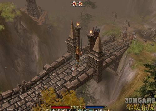 过了魔法桥就到第二章了,这边的怪物是5级起的,这游戏感觉前面几级升级飞快,但是5级之后速度明显减慢了。怪物的经验是按怪物等级给的,1级10点,50级50点,以此类推,精英怪物在拥有较高的掉装率的同时还能获得和普通怪一样的经验值 。。。也是1级10点。。好了切入正题,刚进图不远会有成群的路边小鸡来K你,很好打。没走两步就看见一个人躺在地上,问之,曰:大热天在树影底下我乘个凉不行么我?其实是他被一群土匪洗劫了,同时抢走了他美艳的。。。好吧是女儿。他说大侠你救她回来就让她以身相许。一直右下走就到土匪窝:土匪果然是土匪,攻高血厚,还成群结队,刚开始不知道把他们当小鸡的就要小心了。土匪肯定是要有头的,土匪头霸着那谁的女儿想干嘛这不猪脚出现了么,攻击很高速度也不慢。不过没啥技能,就一高攻步兵,打死之后和女人对话他会跟着你,旁边有堆东西写着此地无银三百两,也去点下可以接到一个挖宝藏的任务。女人还是要还给别人的,不过你不还她会一直跟着你。。。只不过任务下不去了。还了之后女人摇身一变变成一个奸商,并表示即使是我买东西也坚决不打折。介于当地环境险恶,后面BOSS也要用,而且她还是本图唯一一个商人,推荐除法师外的其他职业买个百八十个红药(Crtl+左键点红药,同时适用清包卖装备)这里完了之后再去土匪村,村右边有座桥: