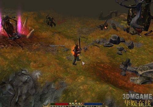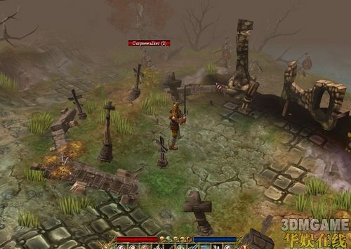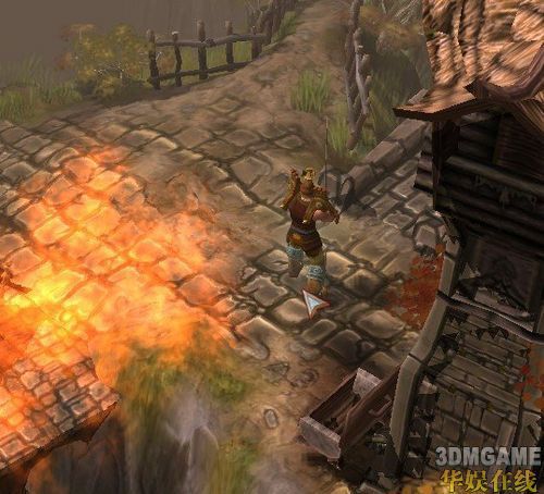 这一章之前请大家认真做一遍眼保健操(虽然本人已经N年没做了)因为这一章的红色的基调实在是。。。而且这一章相对较长。开场动画介绍了一下这里的情况也就是怪物大军攻城。(事实上后来我发现城里活着的就一个人,其他都是怪物,也不知道投石车为什么还要狂砸)出来就给俩NPC,一个奸商,一个赌博机。这里顺带介绍一下赌博机,玩过暗黑基本都清楚,不同的是这里收取固定费用给随机一件装备,完全随机。。。没得选,不是你看谁顺眼就买谁。花的钱跟等级成正相关,1级100,5级500,以此类推,装备等级也是这样,买出来大多是蓝装,小概率出金色。好吧第一个任务,叫你把投石车炸了,虽然我们已经知道这投石车砸的其实是寂寞,但不管那么多了,炸就炸吧:大路左边1个右边3个,投石车附近必须会有长着黄色!号的炸药桶,拿了,到投石车附近用。4个炸完进城,任务场景出现一个拿石柱的BOSS,进城有个老法师说你看这胖子顺眼么?不顺眼就去杀了吧,免费的。这个BOSS就牛了逼了,18级(此时你只有7,8级),N万血,杀红了眼的猪脚上去被一下秒杀。。。而且打它是不掉血的,于是乎我把任务细细看,原来要利用2边的弩车射它。。2个弩车,来回跑就行了,途中注意不要被打到,打了就是秒,还有就是这个BOSS也会“霸王菊花残”把你压倒,连续出俩你就升天了,所以掉血尽量加满。知道怎么杀就很简单了,来来回回几次就行了,回头去城里老法师那叫任务,法师又说了,右边有个骷髅很是嚣张,也是免费的,去吧孩子。介于之前吃过的亏,这次学乖了先看任务,果然此骷髅不同凡响,乃是当年XXXXX,反正先到左边图示位置: