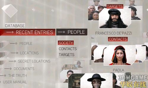 资讯贩子(CONTACTS)算是各章中提供玩家进度指引的人,有的是好友有的是亲戚但都算是站在玩家这边的,至于目标(TARGETS)就是刺杀的对像了。