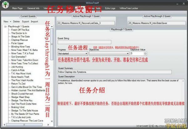 当Progress选单为Started时,Objectives选单会列出该任务的几个项目(就是游戏里画面右边的任务状态所显示的),选中要改的,看Objectives Value,0是未完成(未划勾),1是已完成(已划勾),就这两个数值,改成想要的就行了。