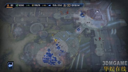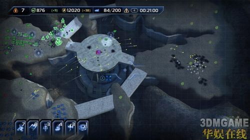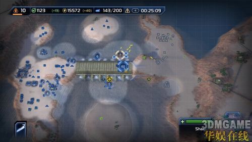 透过卫星视点了解战情发展。左上与左下是我方同盟阵营,一起对付右方的电脑AI,可见到左下方有许多炮弹不断射向敌营。