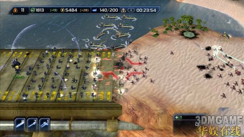 1对1的『ACU无双』范例。将ACU基本武器与护盾研发成功后,尽速带着小兵直冲敌营。这招适合小地图的奇袭作战,若被对方发现我方用『ACU无双』作战,要小心敌人配置大量炮塔与空军的反制。