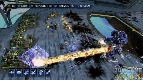 UEF第6大关的激烈战役,右上方的敌军源源不绝地攻过来,必须尽快稳住战线以免波及后方的基地,设置大型护盾能发挥部分抵挡效果以减小我军的伤亡;地面的焦黑部分是之前激烈作战留下的痕迹。