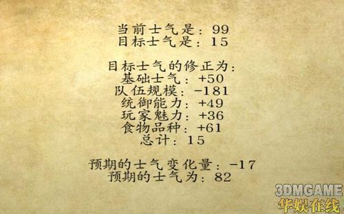 关于士气,其实有2个士气,一个是大家都看得见的那个当前士气。另外一个是目标士气,这个在原版的士气报告里面是隐藏的。当前士气和目标士气的关系是:当前士气会向目标士气靠拢,每次靠拢的量是这2个士气差值的1/5。比如当前士气为99,而目标士气为0,那么下次士气自然变化的时候,当前士气(99)就会-20以靠拢目标士气(0)。然后当前士气变成79,那么下次靠拢就是-16点,而不是-20点。