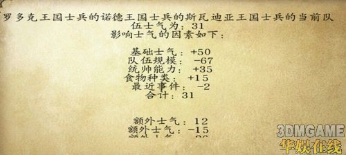 主体部分和以前一样。部队规模是减士气的,而食物种类,玩家的统御能力是加士气的,而基础士气总是+50。 然后最终士气可以称之为部队的整体士气。