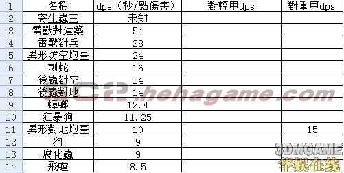 令人意外的,腐化虫的DPS真的很低。后虫的DPS和一个中级单位差不多,是前期防守不错的单位。雷兽可以2秒杀掉一个陆战队,并且是AOE伤害!蟑螂的DPS是没有刺蛇高的,和狂暴狗差不多哦。