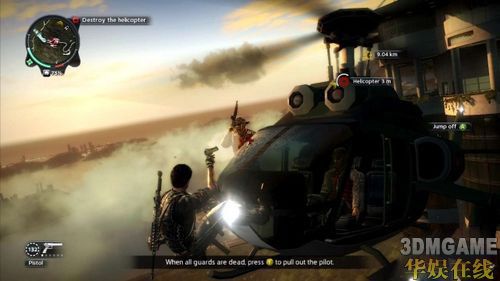 解除了二个炸弹,马上就会出现一架直升机前来攻击玩家,利用勾索飞上直升机并把副驾驶击毙,再按手把Y键就能与驾驶进行QTE抢夺直升机。接着,这次任务的目标会出现在空桥的正中央;切记,使用直升机上的机枪扫射敌人时别误伤到Karl,否则他会被玩家给秒杀而任务失败。