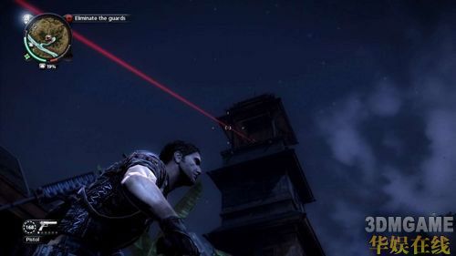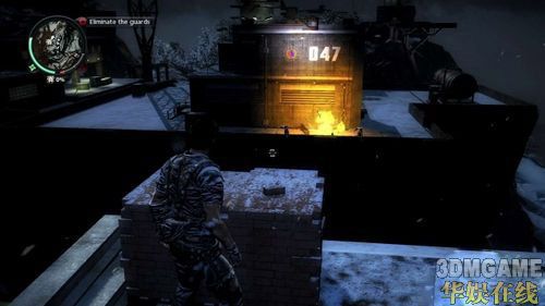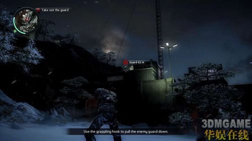 成功潜入到基地任务会更新为「Eliminate the guards」,玩家最好优先处理四个角落的戒哨塔,因为上头都会有一名狙击手,他们会不断地干扰玩家进行任务,而且狙击枪也会秒杀主角。清光所有敌人爬到指定的戒哨塔上,使用通话器接收任务的下一步动作。