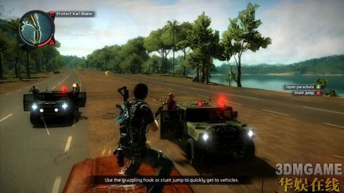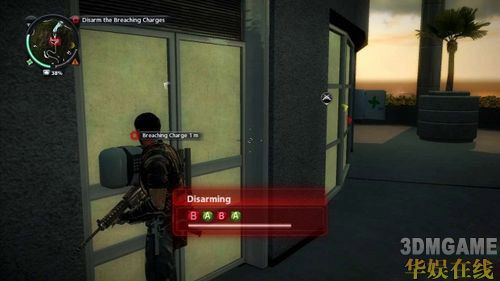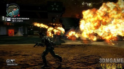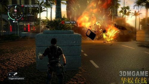 为了方便日后在岛上的行动,Rico需要一名向导的协助才行;接下来的任务就是找到名为Karl Blaine的赌徒,并安全地把他救出来。刚来到赌场的外头时,可以看到中央广场有着不少敌人,如果不想耗太多精神在他们身上的话,可以放置一个Triggered Explosive在最前面的车上,接着再引诱敌人往炸弹的方向前进,按下引爆键就能欣赏一场壮观的烟火秀。