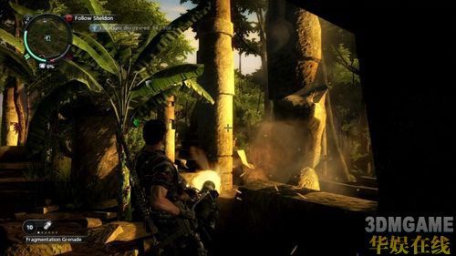 通话结束没多久,便会看到下方一名敌人押着犯人出来,捡起地上的狙击枪给后头的敌人吃上一颗狙击子弹。解决敌人的同时整个基地警报声大作,接着就会有非常多的敌人前来攻击玩家,此时最好贴身保护着任务目标,否则很容易被敌人给打挂。基地内的敌人大部份手持突击步枪,因此最好不要吝啬手榴弹,遇到大票敌人围攻时就不要客气。