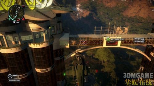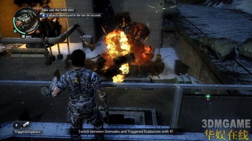 记忆卡到手之后,Maria会搭乘直升机前来协助Rico前往下一张记忆卡地点,只要朝着直升机发射勾索飞上去即可。第五张记忆卡位于通往基地内部的桥梁上,取得记忆卡的同时还会触发敌人启动地对空炮台,想要安全地搭机离开就得把这二座炮台给摧毁掉。玩家如果用手榴弹来破坏炮台非常浪费也没有效率,先把该区域附近的敌人统统解决掉后,就能在炮台后方的箱子内取得Triggered Explosive并摧毁之。接着只要再利用勾索飞到直升机上,就可以完成任务。