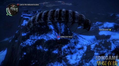 拿回PDA后,就能继续朝降落预定地飞行(Landing Zone),即将到达陆地前可以按下手把A键开伞,再按一次手把A键则是能即时收伞,回到飞行冲刺的状态。成功着陆后便进入教学关卡(第一个探员任务)。