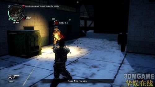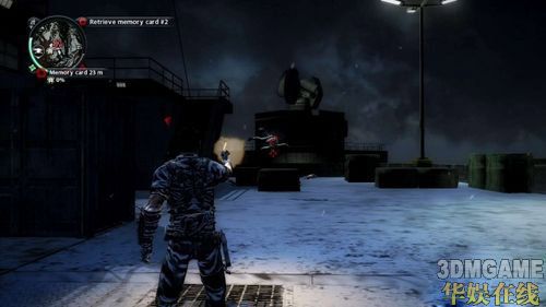 取得第一张记忆卡处,对面屋顶会出现几名敌人。玩家无须刻意飞过去与敌人近战,只要利用勾索把上方的油桶给拉下来,把敌人炸死即可。其实类似的攻击方式,在日后的游戏过程里都使用得上,只要好好利用环境物件来攻击敌人,就能省下不少弹药。