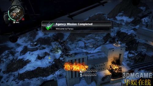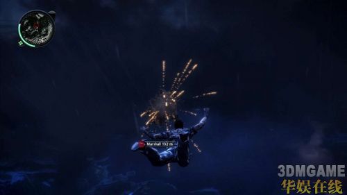 Rico一行人搭乘直升机抵达Panau岛时,突然遭到莫名的炮击欢迎仪式洗礼,同行的队友Marshall在直升机被击中的瞬间,不慎失足跌出机外。为了拿回下载敌方资料用的PDA,Rico只好不顾性命地跳机把PDA拿回来。利用手把的左、右类比调整飞行的方向,朝着画面红点标示处(Marshall)飞行就能触发取回PDA的过场动画。