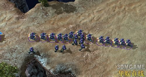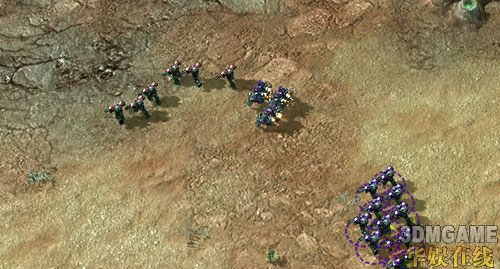 而Glad一开始就迅速用一个枪兵占据了望塔开视野,在家里另一有出口放下2个兵营。(说到这里介绍下这张地图的基地有2个出口,一个是高地,另一个出口是被岩石挡住的)完成兵营后升空并飘下去,越过了岩石。就这样缩短了兵出门的距离,这也大大加快了RUSH的进程,这一招是本场比赛的一大亮点。之后同时拉出家里的一队SCV进行辅助。
