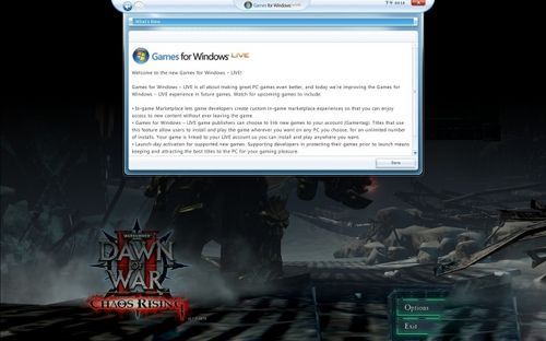 目前有不少电脑游戏使用微软的Game for Windows─LIVE服务(以下简称GFWL)进行连线与资料的管理,《战锤:战争黎明2》/《混沌崛起》就是其一*。简单的说,GFWL就是电脑版的Xbox LIVE整合服务,玩家在使用GFWL的游戏里要注册一个玩家代号(Gamertag)以进行游戏、连线对战与好友管理,玩过的游戏也会取得相关的成就。 Xbox LIVE的玩家可以用现有的帐号直接登入使用GFWL的游戏,两者资料互通,从个人资料、玩家图示、游戏成就到好友名单都是通用的。玩家可以邀请线上好友进行同一款电脑游戏、和正在玩Xbox 360的朋友传讯或语音聊天,目前除了虚拟人偶与派对功能外,Xbox 360上的LIVE功能在GFWL上全都能用。