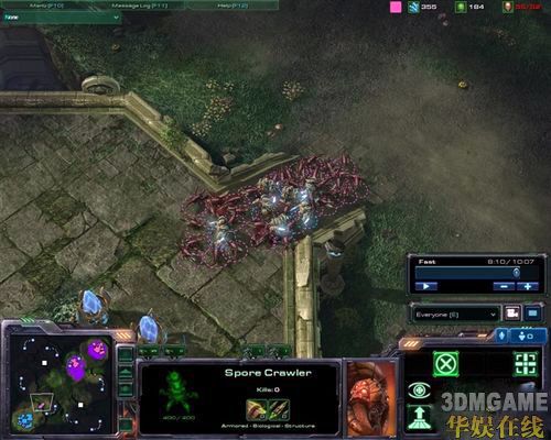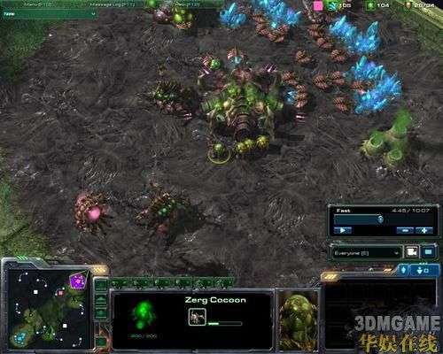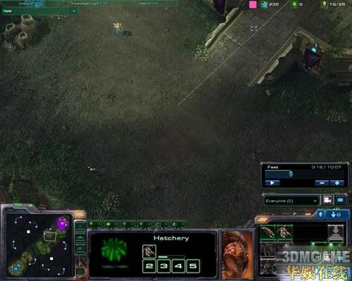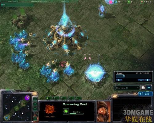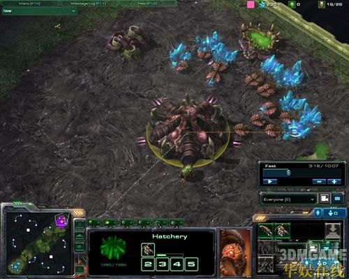 气矿采集足够的时候在孵化池中给小狗提速,将基地多造的农民运到建好的分矿处,让第二个女王给基地产卵。