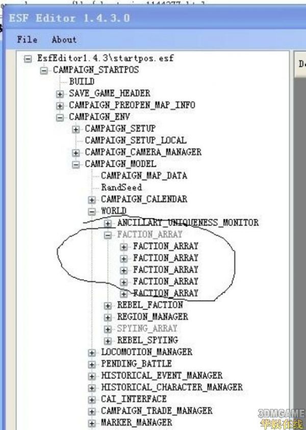 打开你想要修改的ESF文件 ,譬如我这里修改的是埃及会战之下的startpos.esf