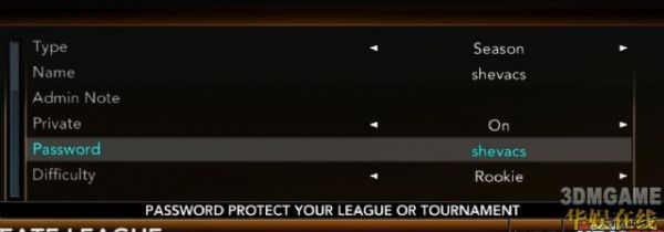 新加入Online Leagues模式,这个是昨晚我们试了一下目前唯一可以正常联机的模式,就是进Game Mode,最左边有Online Leagues,最左边是create league 创建联赛,进入后可以自己输入联赛名字,参与玩家数量,难度等等,还可以设置主机密码,如下图,private 选择on,输入password那么进入你的主机就要密码了.其他默认就好不用修改了.