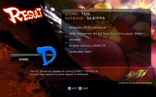 回到街头霸王4,我安装并完全运行了测试软件后,软件得出了SF4在我电脑上运行的体验指数仅为D级。GF9500GT显卡,2G 800 DDRII内存,这些其实都已经完全可以满足SF4流畅运行了,唯一不争气的就是我那块AMD 64*2 3600+的CPU……总所周知此类游戏对CPU的要求还是蛮高的。