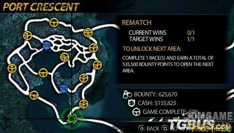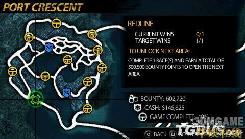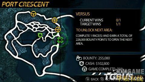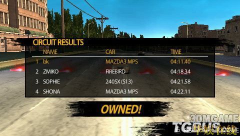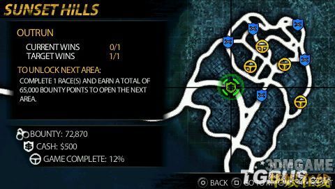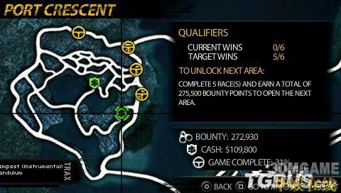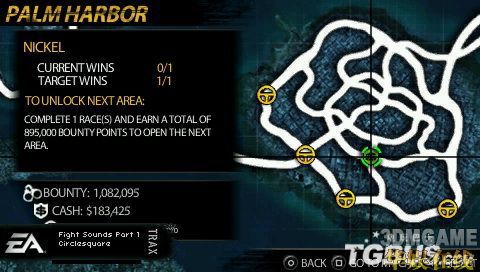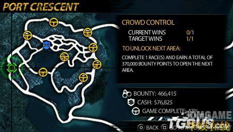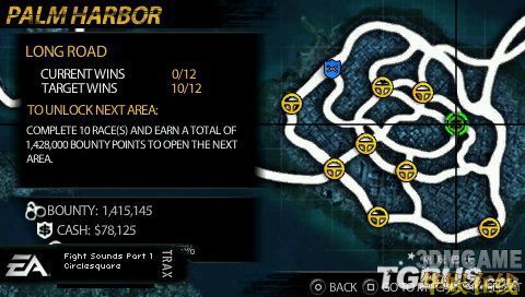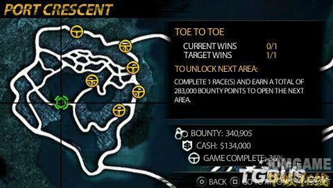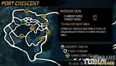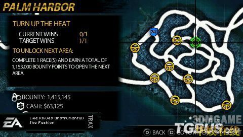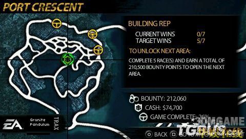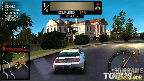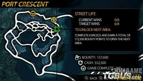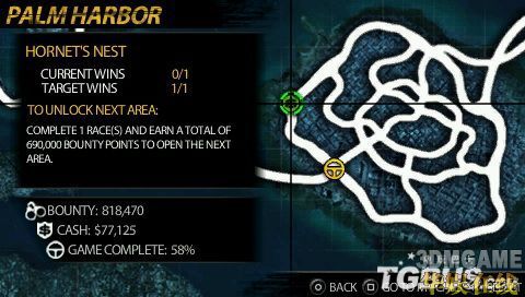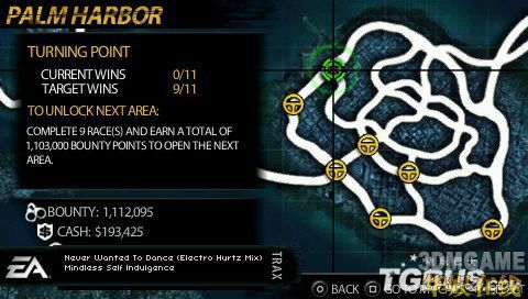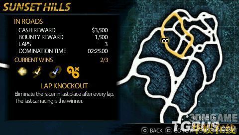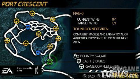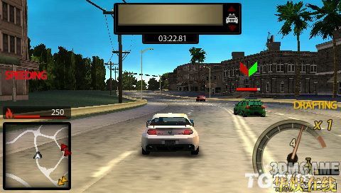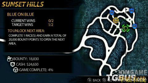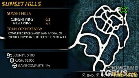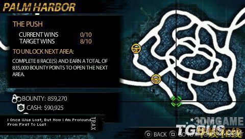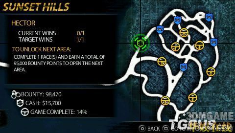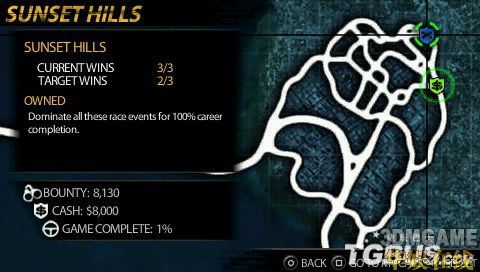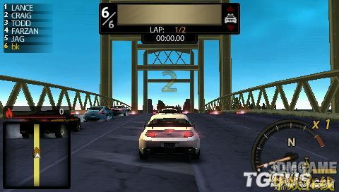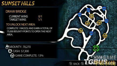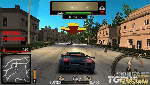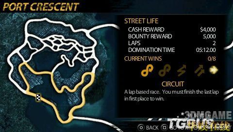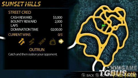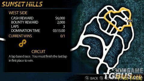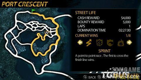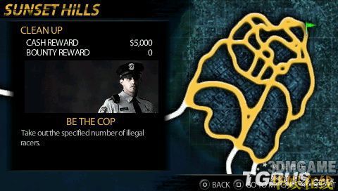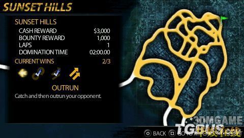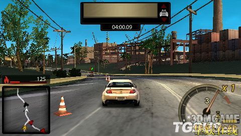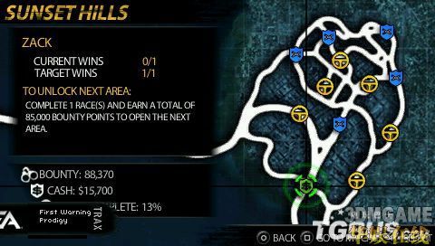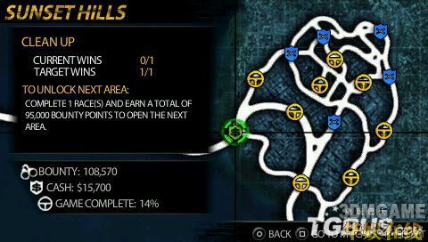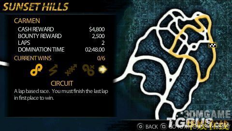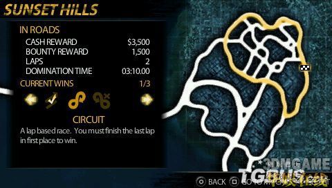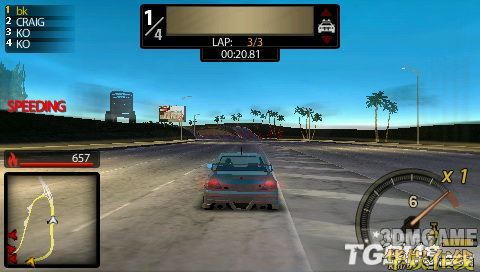 psp版本的极品仍然没有使用pc或者家用机上的开放性模式.地图从sunset hills 进行游戏.选择后出现了极品飞车的常规赛车类型.记圈赛,速度赛以及追逐赛.第一个记圈赛为两圈,赛道并不难.只有一处容易撞墙,没啥多说的,轻轻松松就拿下了第一.