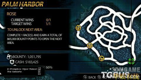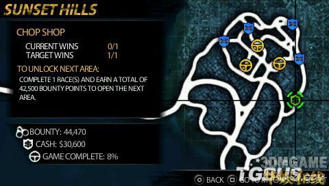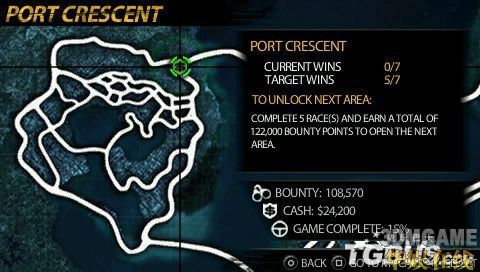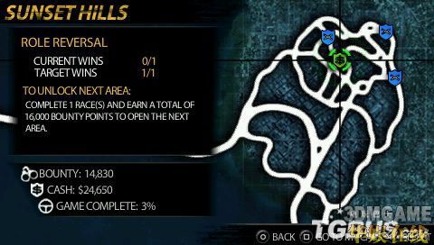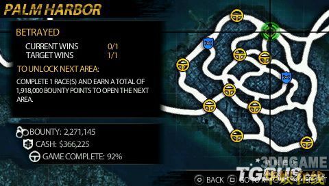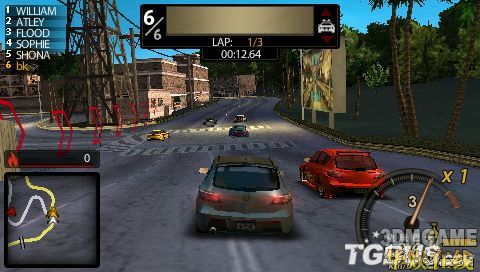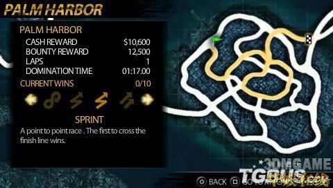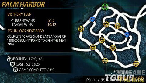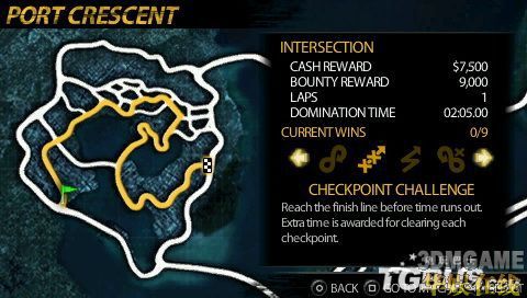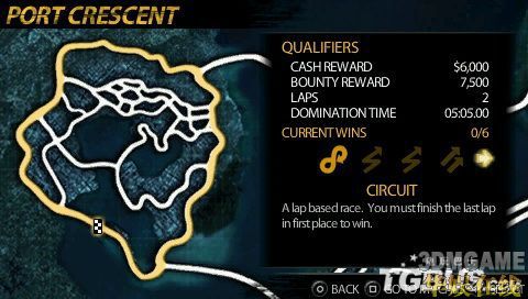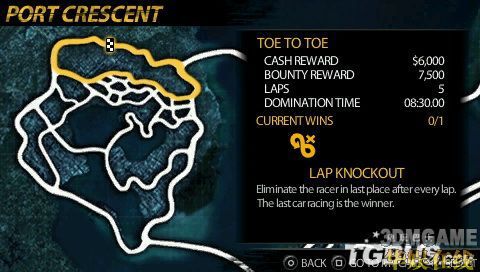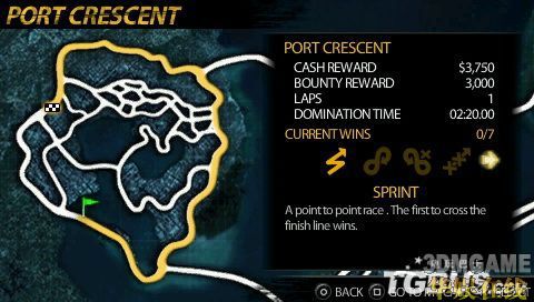 首先登场的依然是记圈赛.感觉地图有些小曲折,在比赛过程中,也真的是如同地图一样,有几个弯脚真的十分恐怖.有几处道路十分狭窄,而且电脑的速度也随着你的不断升级也在不断提高.所以在领先的时候,一定要尽全力拉开距离.这样子的话就算过弯有失误也不会有太大问题.记住入直角弯的时候一定要先放开油门,接着R1甩尾进弯,否则的话一定撞墙.掌握时机是十分重要的.