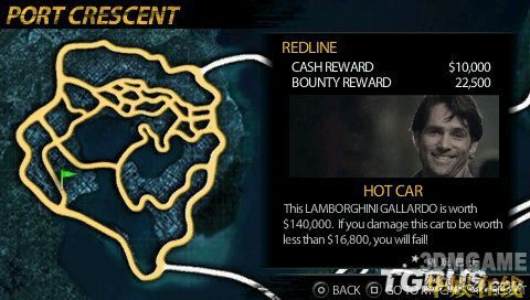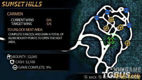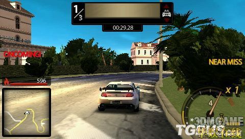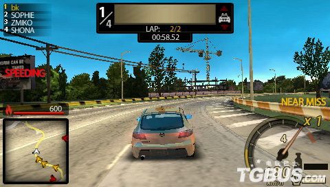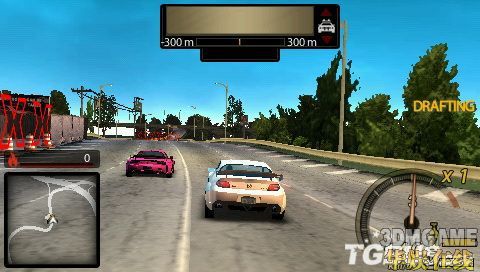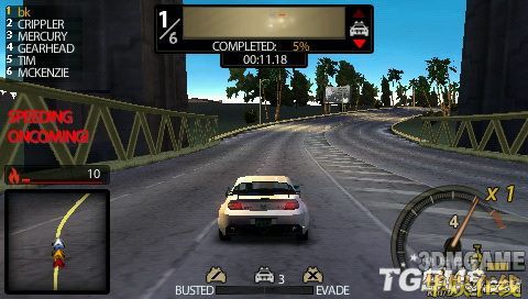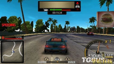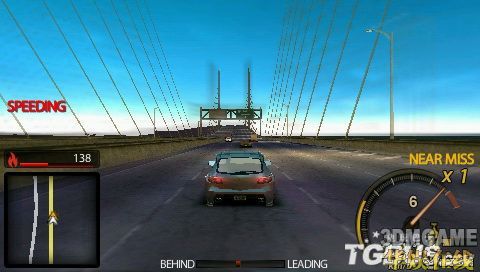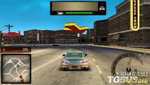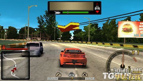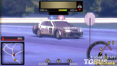 一年一度的极品飞车再次上市。接下来就由笔者带入大家走进赛车的世界!和以往的极品飞车一样,刚开始建立档案后,都会有一场暖身赛.一开始就驾驶着一辆超级豪华的跑车飞驰在高速公路上,紧紧跟在身后的,而是追捕你的POLICE部队.不过不用紧张,车种的悬殊POLICE是完全追不上你的.一路飞车解决战斗后,就会进入一段动画,Maggie Q的真人演出也出现在了psp上.一段对话后,就开始选车.选了一辆马自达直接进入地图开始正式闯关.Map 1 - Sunset hills: