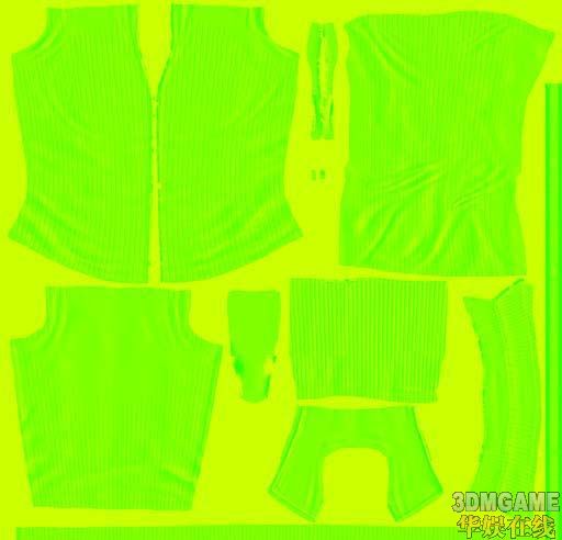 到这里,上衣贴图的修改全部完成。上衣的法线贴图(黄绿色的那张)的修改需要具备一定的3D光照基本常识,黄绿颜色的不同会导致光线下的明暗变化,是表现细节的更高境界,但是修改起来相对复杂,这里就不详细说明了。