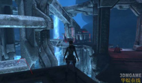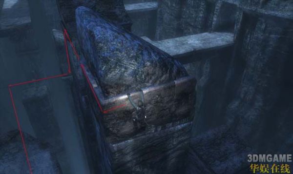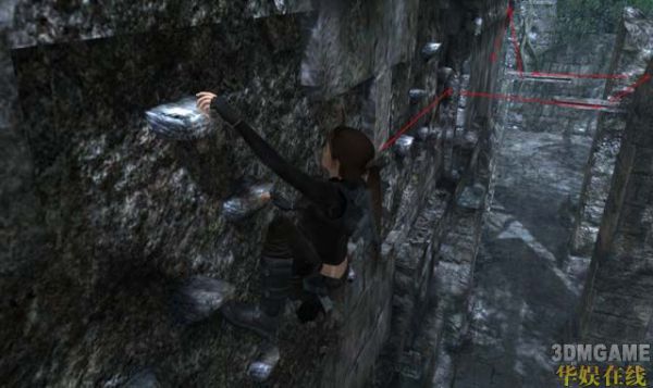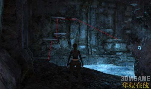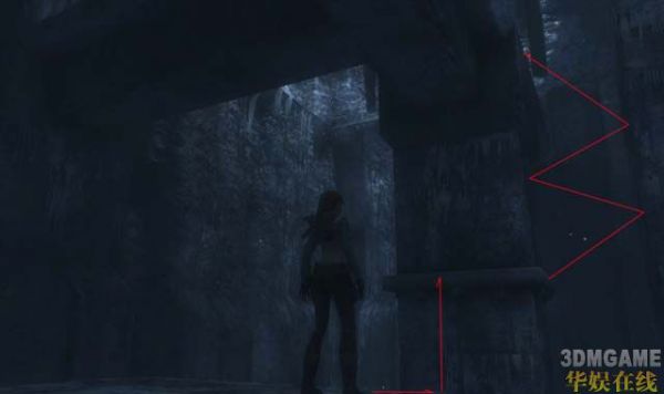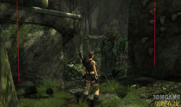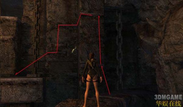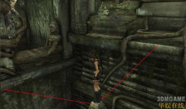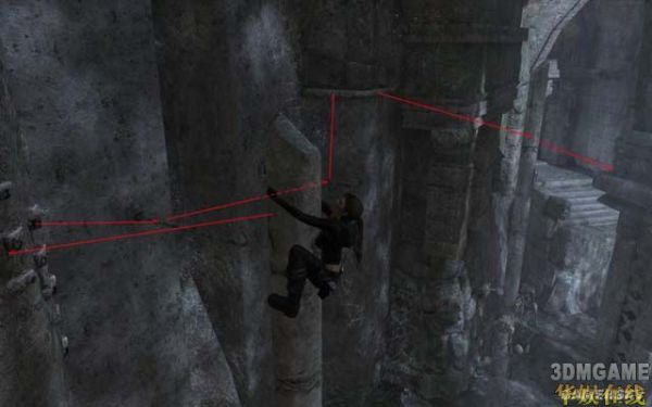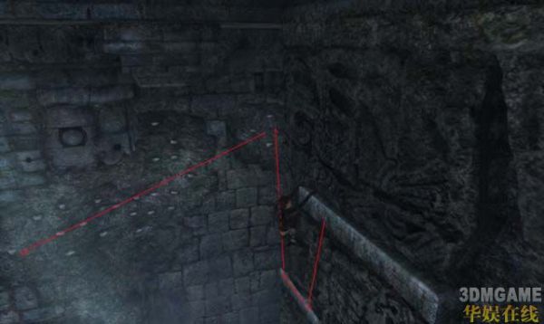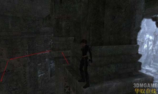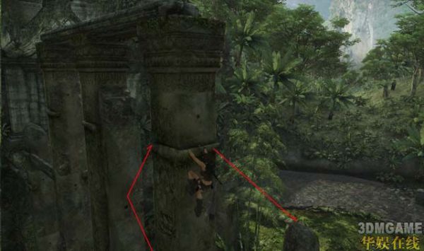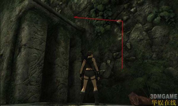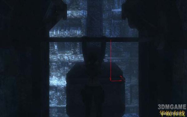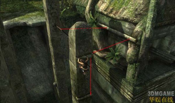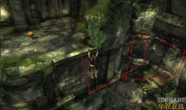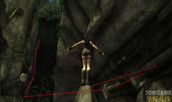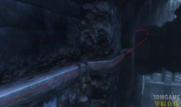 过来之后到达如图所示的位置,Lara正面的地方有可以抓的边缘