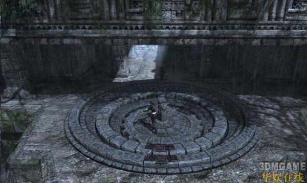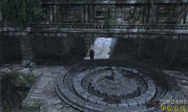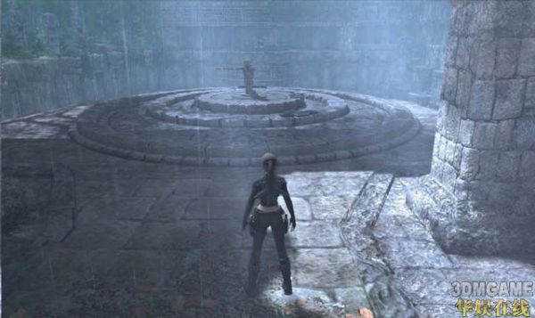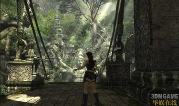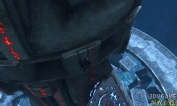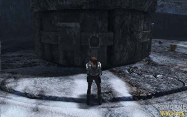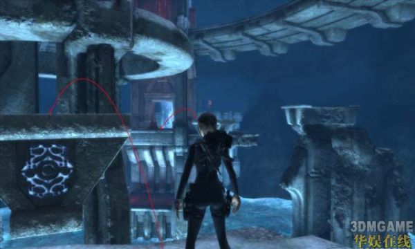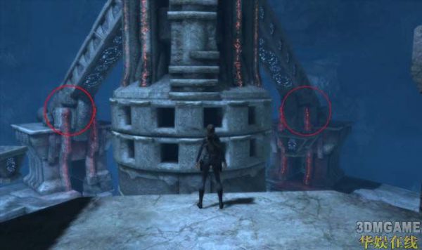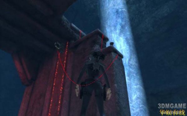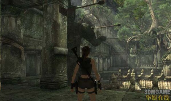 上到最高点之后跳到高塔能够旋转的部分,稍等一会,就会带着Lara转到最后一个支撑物的斜坡处,在此处松手,Lara会滑到可以破坏的机关所在,好了破坏它吧