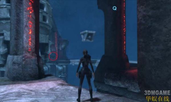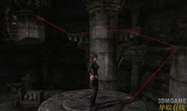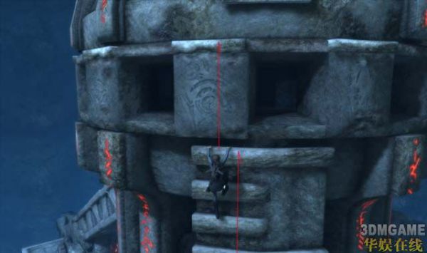 全部能推的石墙都推进去之后来到下图位置,利用Z字跳回到第一层的一座因为崩塌而变成了石柱的平台上