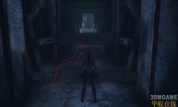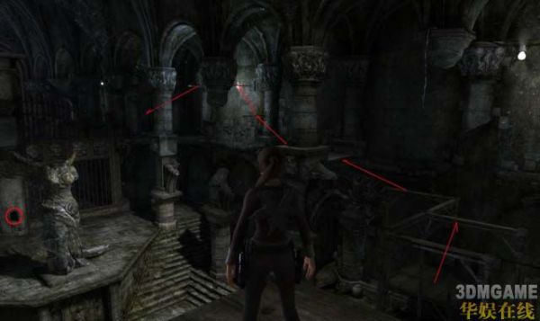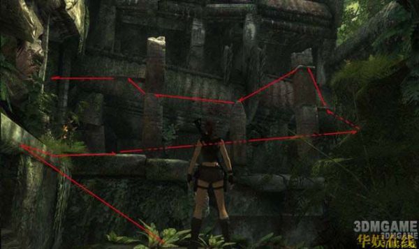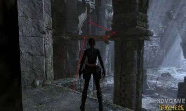 一路来到Lara老爹的破烂研究室,推动柱子到如图的位置,按照箭头然后跳上去