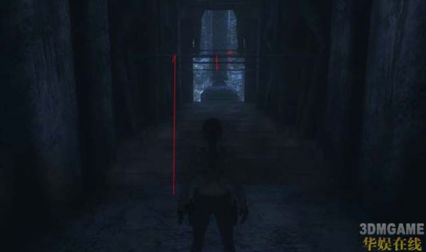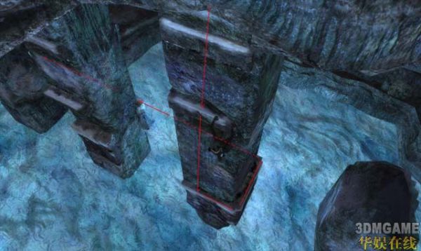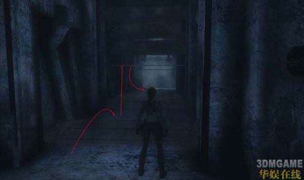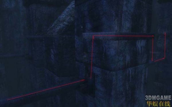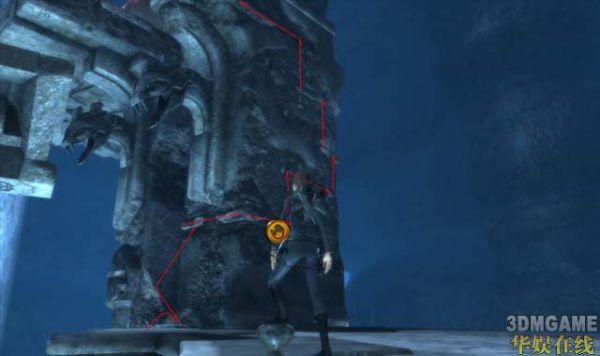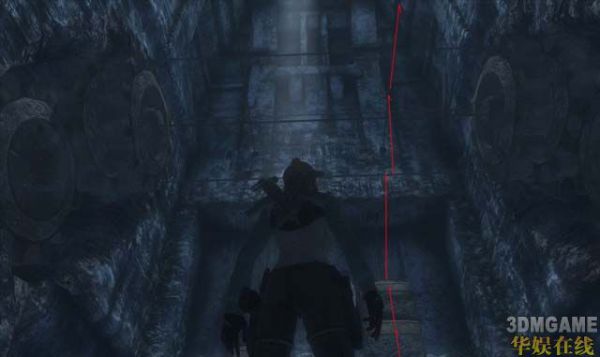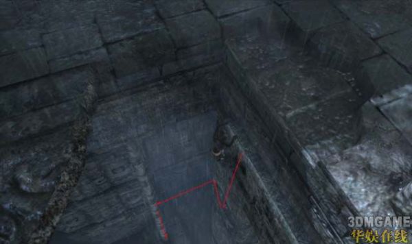 按照上图前行至最初的章鱼大厅的最上层,利用钩锁荡至对面,爬上石头后从斜坡滑下,身后就是出口