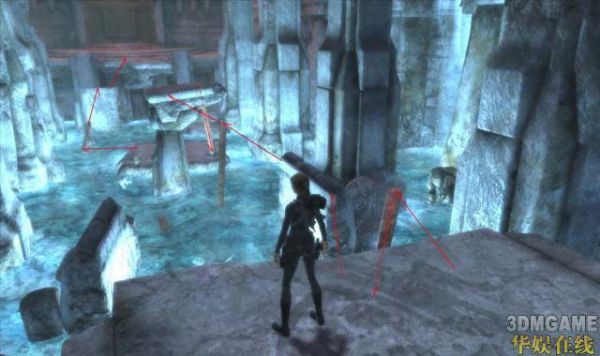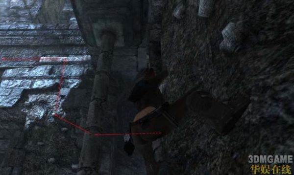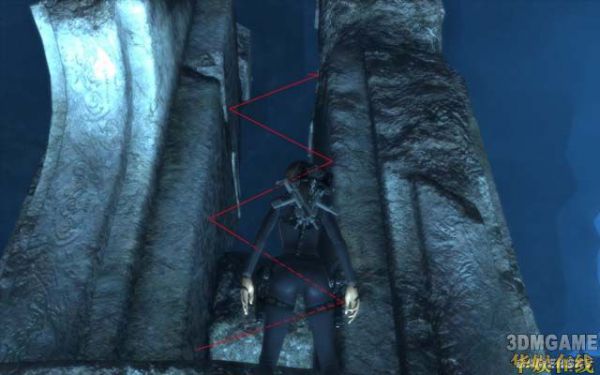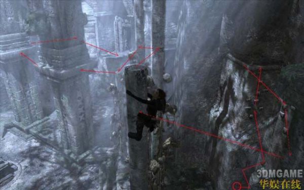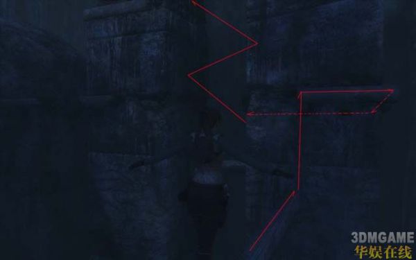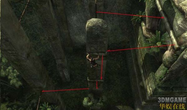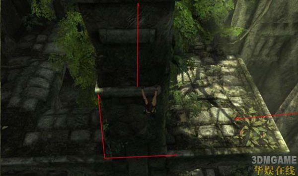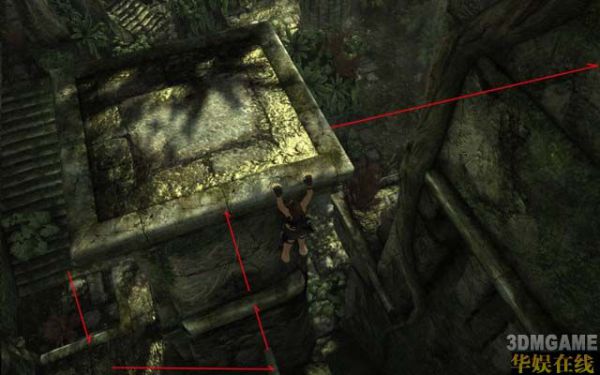 下图是平台崩塌超动作之后所到达的第一个位置,但是此时Lara抓住的边缘也会崩塌,所以请尽快按照箭头方向移动到下一个位置