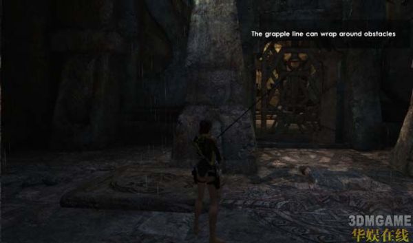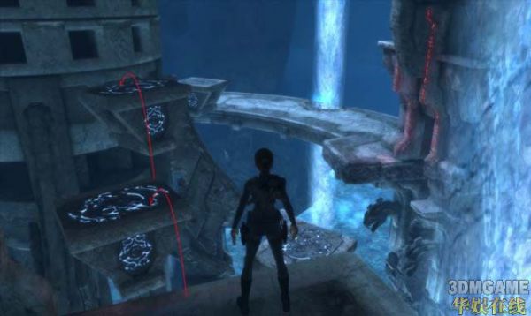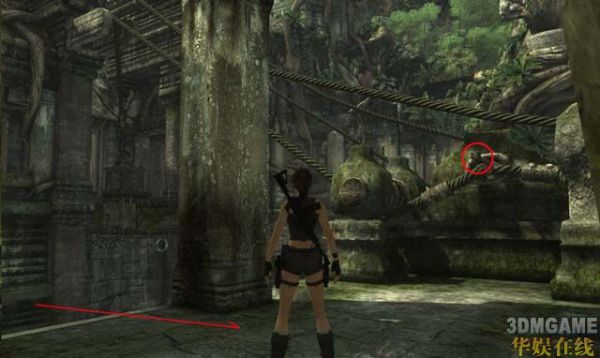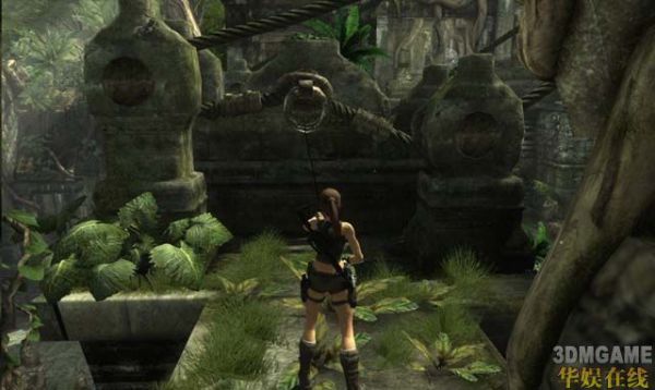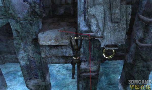 在下图中需要Lara向前跳,用钩锁抓住吊环然后反跳到对面的平台上