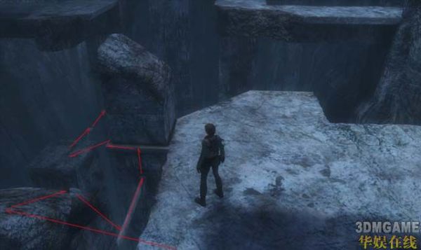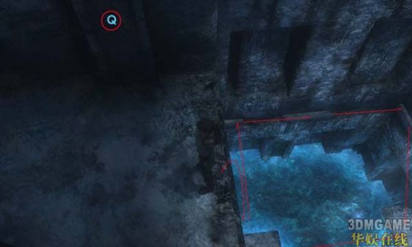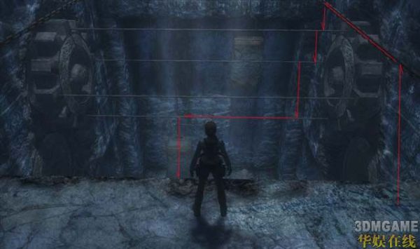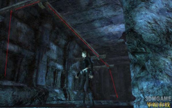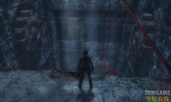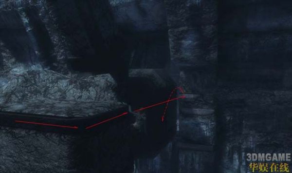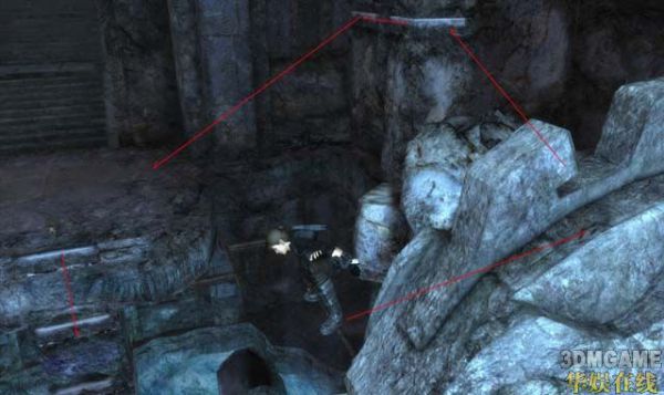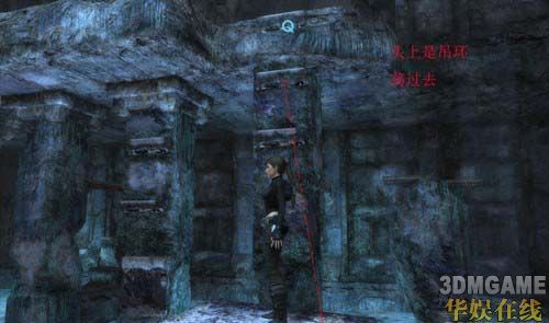 站在洞穴内部的边缘,可以看到头上有个吊环,利用吊环下到底部,荡至可抓边缘,然后按照图示出去