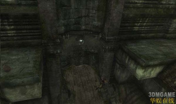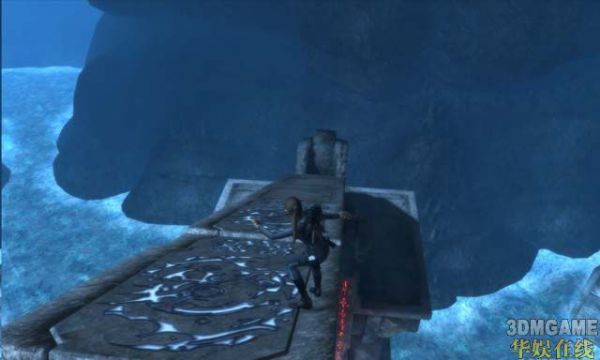 从下图的位置跳下,用钩锁荡到图中左下角的平台,在这里要继续向左拉动石桥