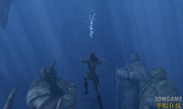 潜入水底看到巨大的人像和远处的庞大遗迹