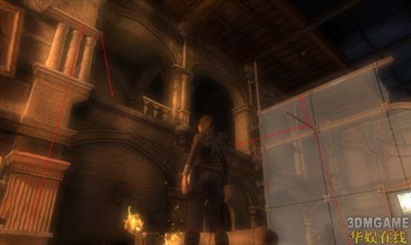 大门是时限机关,如下图所示抓紧时间爬上柱子,然后利用钩锁荡入大门
