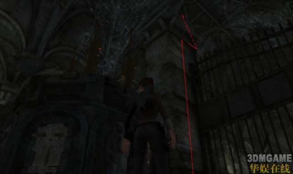 在大厅里,如下图所示的地方,出现Q的提示,抛出钩锁,沿着墙壁上去