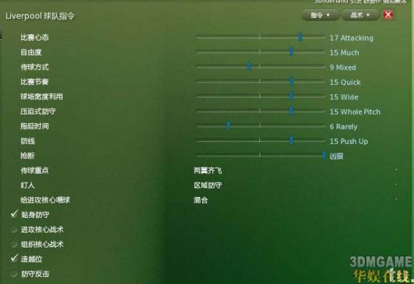 身后球:本人的观点是全开,即使助理教练告诉你某某把球经常传到对方脚下。中卫,前锋居中,其他人为经常,如果某人的状态不好也可调成居中或从不。