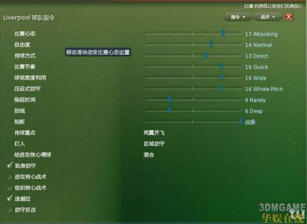 拖延时间:根据战况而定,不一定把拖延时间拉到最低球队就能改变局面,本人的心得是如果球队能够持续不断的创造机会不宜太过控制时间,也就是居中偏低一点,如果对手不停创造机会 也不宜太过浪费,居中偏高一点即可。个人觉得这个选项与球队心态有关(纯属讨论),高进攻的心态结合了从不拖延时间的要求容易给球队造成紧张,反而更加打不开局面。同理防守反击或者防守的心态如果太过拖延时间会给球队带来消极影响,对手会更加凶狠。尤其是比赛快要结束时(感觉SI是不是制定了隐性程序)